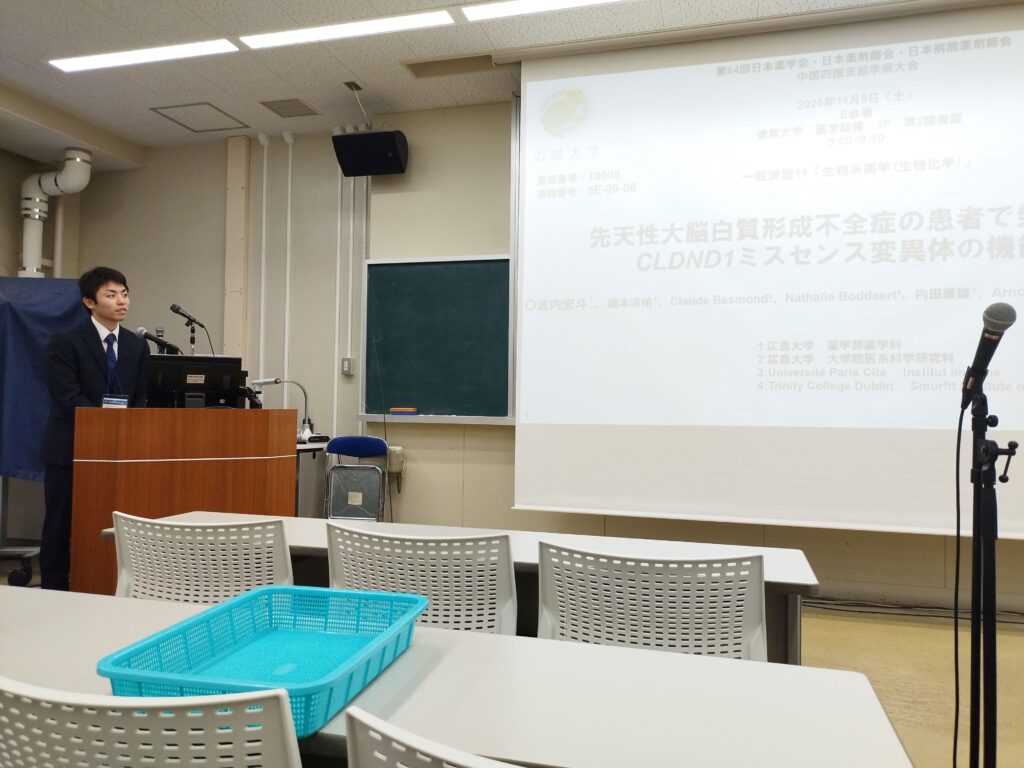 11/12/2025 / 最終更新日時 : 11/17/2025 admin イベント 第64回日本薬学会・日本薬剤師会・日本病院薬剤師会中国四国支部学術大会で研究発表を行いました 2025年11月8-9日に徳島大学蔵本キャンパスで行われた、第64回日本薬学会・日本薬剤師会・日本病院薬剤師会中国四国支部学術大会に参加し、橋本助教と3人の学生が研究発表を行いました。