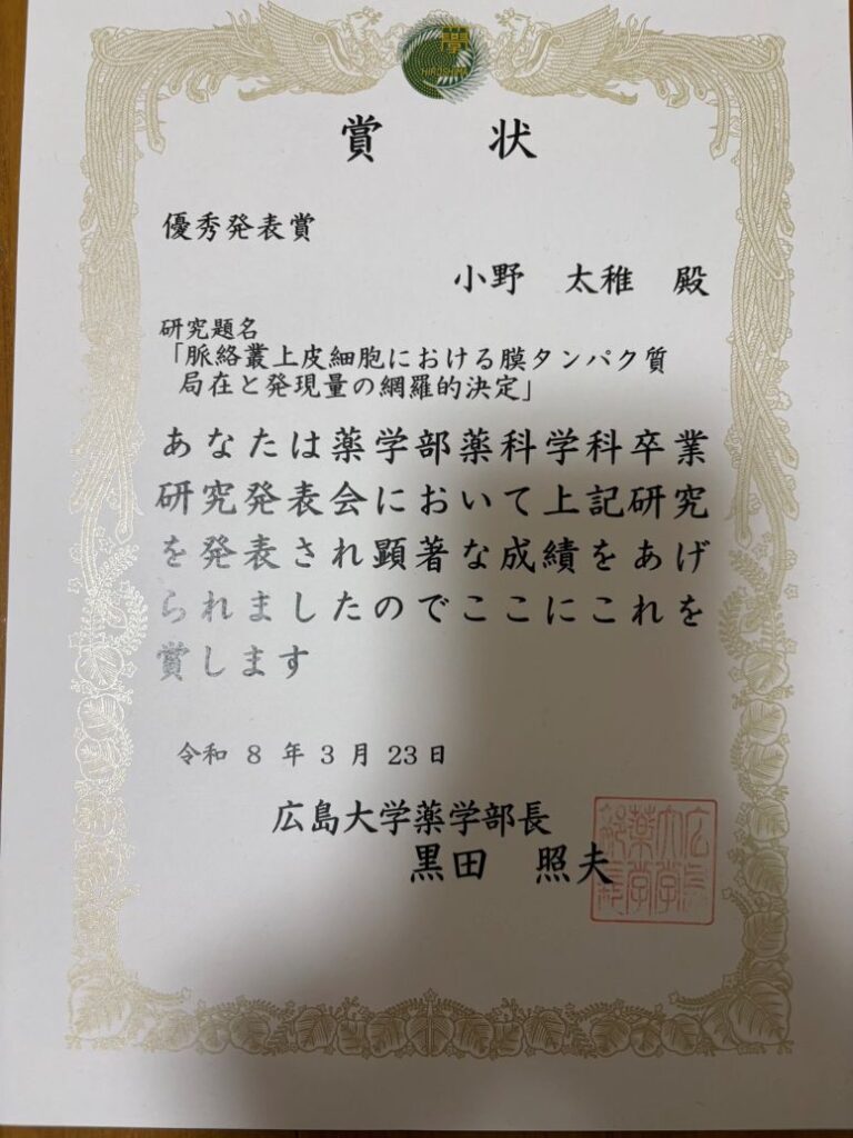 03/24/2026 / 最終更新日時 : 04/07/2026 admin 受賞 小野太稚君(B4)が2025年度卒業論文発表会で優秀発表者に選出されました 2026年3月6日に行われた卒業論文発表会において、小野太稚君(B4)が優秀発表賞を受賞し、表彰されました。おめでとうございます!
